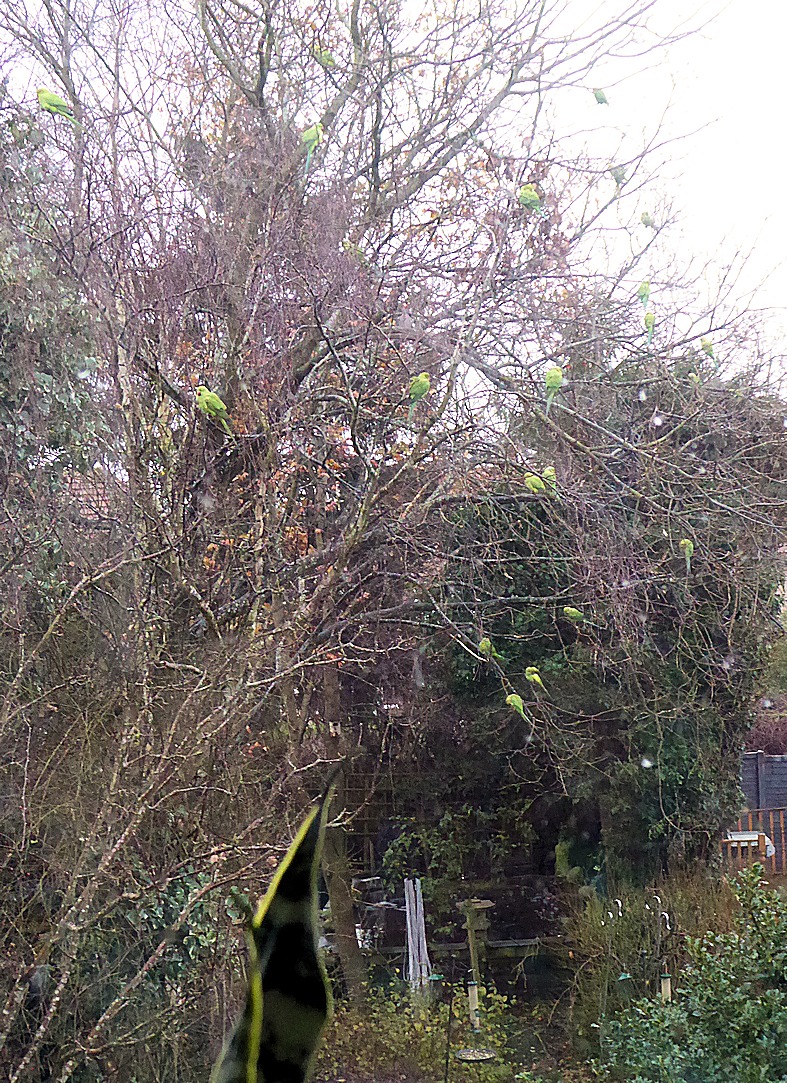 These birds are ridiculous! This morning, about 09:15, we had a garden full of ring-neck parakeets (Psittacula krameri from Northern India): 26 of them sitting about the trees and on the almost empty feeders; in the rain. And that’s the ones I could see! And it wasn’t just parakeets, the full count was at least: