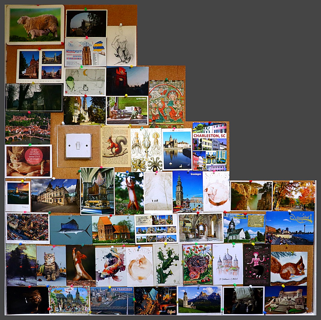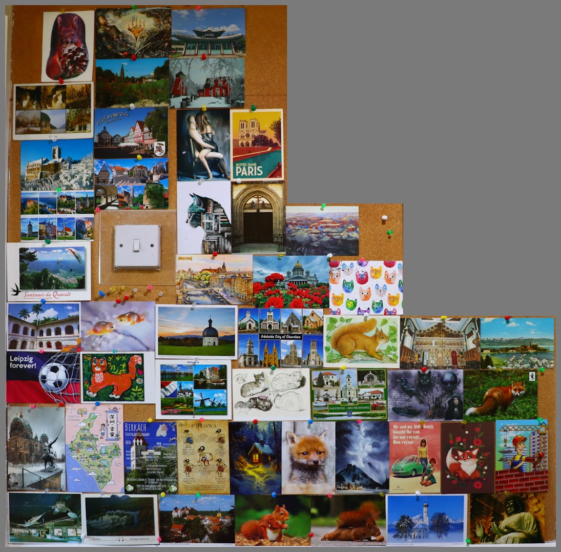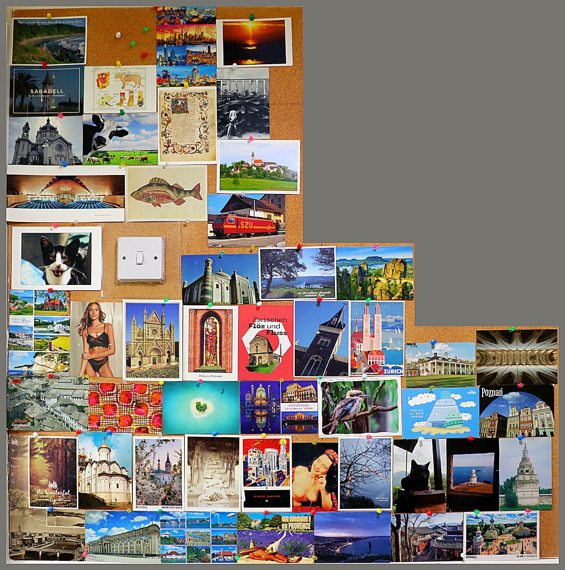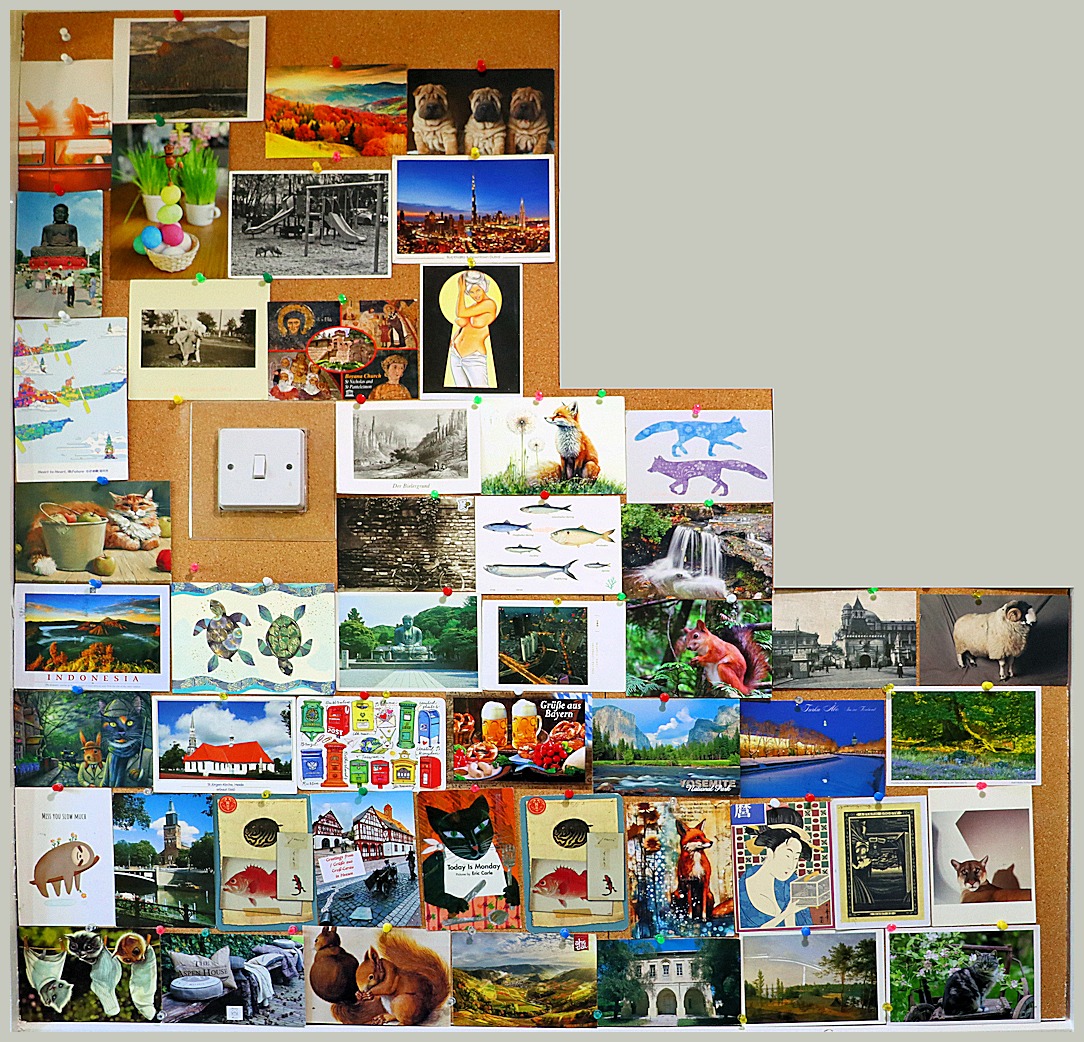 Like many (probably most) Postcrossers I’m filing the cards I receive. I’m also posting them on our corkboard as they arrive – it just takes 50 cards. When the board is full I photograph it, before filing the cards and starting over. At the time of writing (mid-October 2024) I’ve received 220 cards in 18 months. Here are the full corkboards so far …