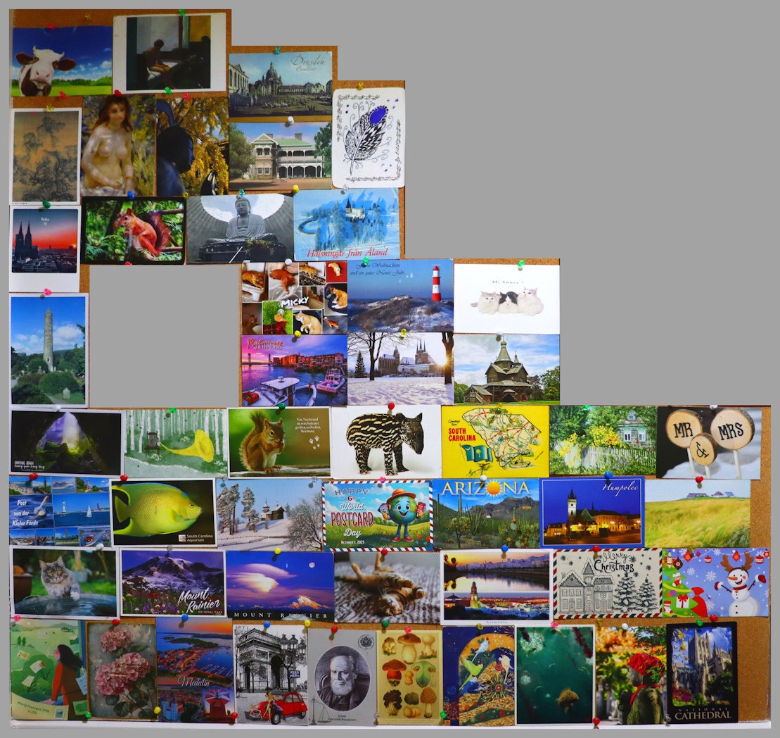 Like many (probably most) Postcrossers I’m filing the cards I receive. I’m also posting them on our corkboard as they arrive – it just takes 50 cards. When the board is full I photograph it, before filing the cards and starting over. At the time of writing (mid-October 2024) I’ve received 220 cards in 18 months. Here are the full corkboards so far …
